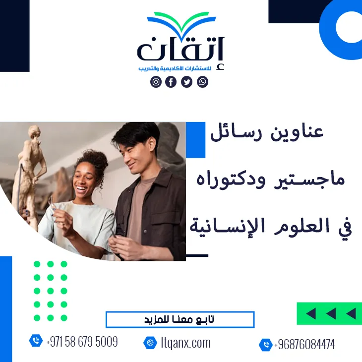 تُعد العلوم الإنسانية مفتاح فهم الإنسان وسلوكه وثقافته؛ حيث إنها تضيء الجوانب الفكرية والاجتماعية التي تشكل جوهر الحياة، وإدراكًا من شركة إتقان للاستشارات الأكاديمية والتدريب لأهمية هذا المجال لدى الباحثين، وانطلاقًا من تميزها في الجودة والكفاءة الإبداعية بفضل فريقها المتخصص أعدت الشركة قائمة حصرية من عناوين رسائل ماجستير ودكتوراه في العلوم الإنسانية؛ لكي تكون مصدر إلهام ودعم لكل من يسعى نحو بحث علمي متميز ورؤية أكاديمية متجددة.