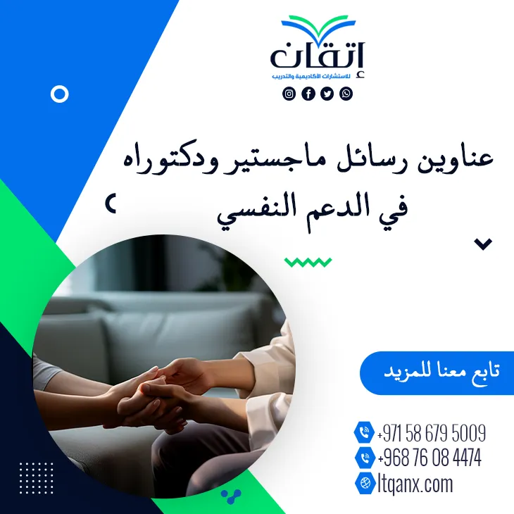 وفي النهاية تؤكد شركة إتقان للاستشارات الأكاديمية والتدريب مكانتها بوصفها شريك النجاح والتميز الأكاديمي لكل باحث طموح، فقد سعت إلى توفير عناوين رسائل ماجستير ودكتوراه في الدعم النفسي بعناية علمية ومنهجية تواكب احتياجات البحث المعاصر، وإذا كنت تطمح إلى دعم أكاديمي احترافي يختصر عليك الوقت والجهد، فإن إتقان تضع خبرتها بين يديك، ويمكنك التواصل معنا بكل سهولة عبر تطبيق الواتساب للحصول على الدعم الأكاديمي الذي تستحقه.