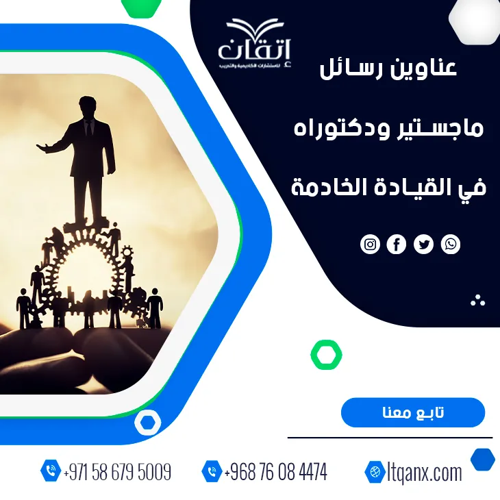في ختام الحديث، تتجلى القيادة الخادمة كنموذج قيادي إنساني يعيد الاعتبار لقيم العطاء والتمكين وبناء الثقة داخل المؤسسات، وقد أسهمت عناوين رسائل ماجستير ودكتوراه في القيادة الخادمة في إثراء الفكر الإداري المعاصر، عبر تحليل أبعادها وتأثيرها في الأداء والرضا المؤسسي، شركة إتقان شريك النجاح والتميز الأكاديمي، ترافق الباحثين بخبرات علمية ودعم بحثي متكامل، يمكنكم التواصل بكل سهولة عبر تطبيق الواتساب للحصول على الإرشاد والدعم الأكاديمي المتخصص، اجعلوا القيادة الخادمة منطلقًا حقيقيًا لبناء مؤسسات أكثر وعيًا وتأثيرًا واستدامة.