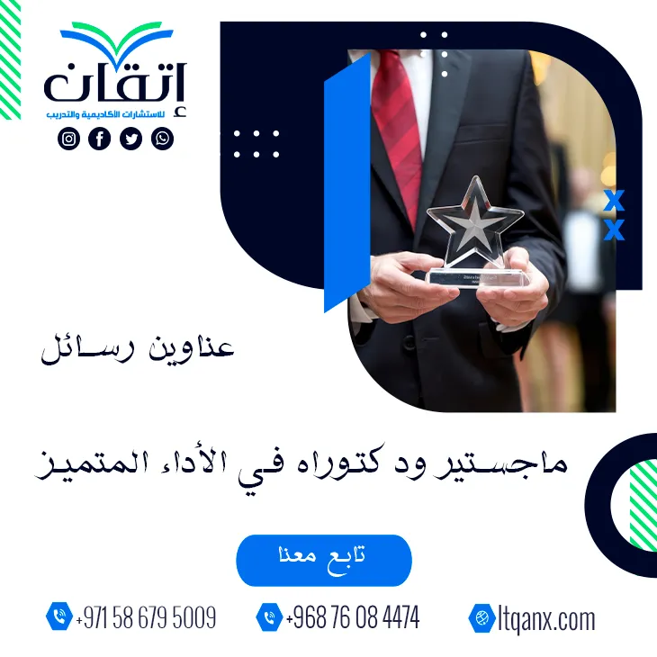 الأداء المتميز أصبح معيارًا حيويًا لقياس قدرة المؤسسات والأفراد على تحقيق التميز والتفوق في بيئات العمل التنافسية، وفي هذا الإطار، تبرز عناوين رسائل ماجستير ودكتوراه في الأداء المتميز كمرجع علمي مهم للباحثين لفهم استراتيجيات تعزيز الفاعلية والابتكار المؤسسي، وتتفرد شركة إتقان للاستشارات الأكاديمية والتدريب بالجودة والكفاءة الإبداعية وامتلاكها فريق عمل متميز وذو خبرة عالية؛ لذلك قدمت إتقان باقة من أحدث وأهم العناوين البحثية لدعم الباحثين وتمكينهم من التميز العلمي.