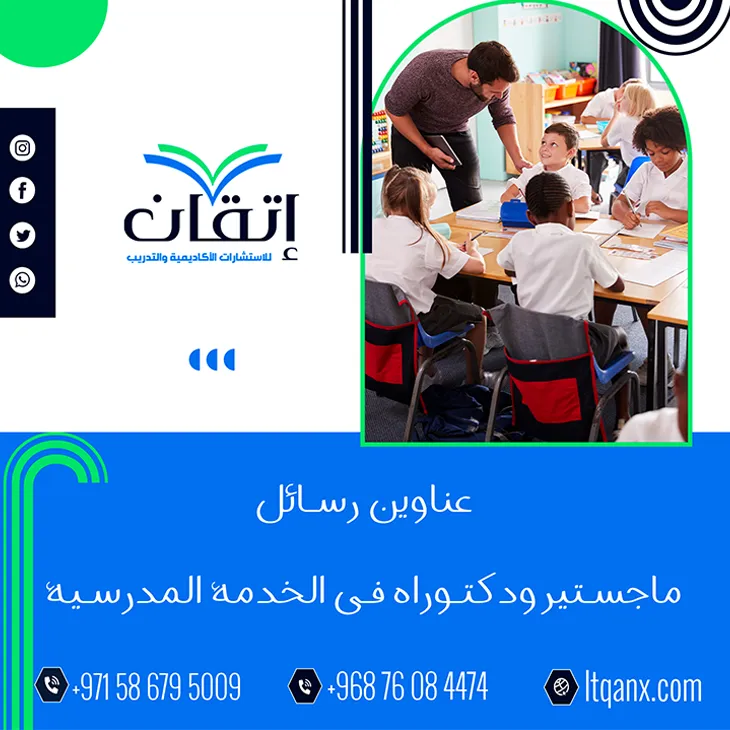 وفي الختام تؤكد شركة إتقان التزامها كشريك استراتيجي في التميز الأكاديمي؛ وذلك من خلال توفير أحدث عناوين رسائل ماجستير ودكتوراه في الخدمة المدرسية ومرافقة الباحثين بخبرة واسعة ومهنية عالية، ويسعد فريق إتقان استقبال تواصلكم عبر تطبيق الواتساب بكل سهولة للحصول على الدعم الأكاديمي وتحقيق أفضل النتائج البحثية.
