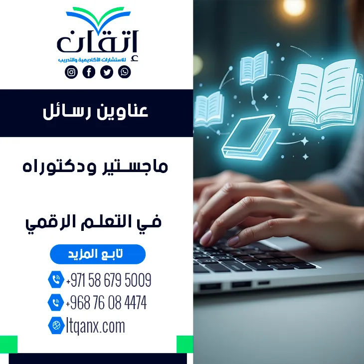 وفي الختام يظل التعلم الرقمي أحد أبرز محاور التطوير التعليمي في العصر الحديث؛ مما يجعل اختيار عناوين رسائل ماجستير ودكتوراه في التعلم الرقمي خطوة أساسية نحو التميز الأكاديمي، وتؤكد شركة إتقان للاستشارات الأكاديمية والتدريب مكانتها كشريك النجاح والتميز الأكاديمي، عبر تقديم دعم احترافي متكامل للباحثين، وكما يمكنكم التواصل بسهولة عبر تطبيق الواتساب للحصول على استشارات أكاديمية متخصصة تدعم مسيرتكم البحثية بثقة وتميز.