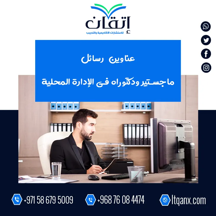 تبدأ رحلة التنمية من قلب المجتمعات المحلية؛ حيث تمثل الإدارة المحلية محورًا أساسيًا لاتخاذ القرار وتحقيق التنمية المستدامة، وتبرز هنا أهمية عناوين رسائل ماجستير ودكتوراه في الإدارة المحلية كمرشد للباحثين لفهم أعمق وتحليل أكثر دقة، وانطلاقًا من وعيها بقيمة هذا المجال تقدم شركة إتقان للاستشارات الأكاديمية والتدريب فريق عمل متميز يجمع بين الخبرة والجودة والكفاءة الإبداعية، ويعرض قائمة من أحدث وأهم العناوين البحثية لدعم الباحثين بشكل فعال.
