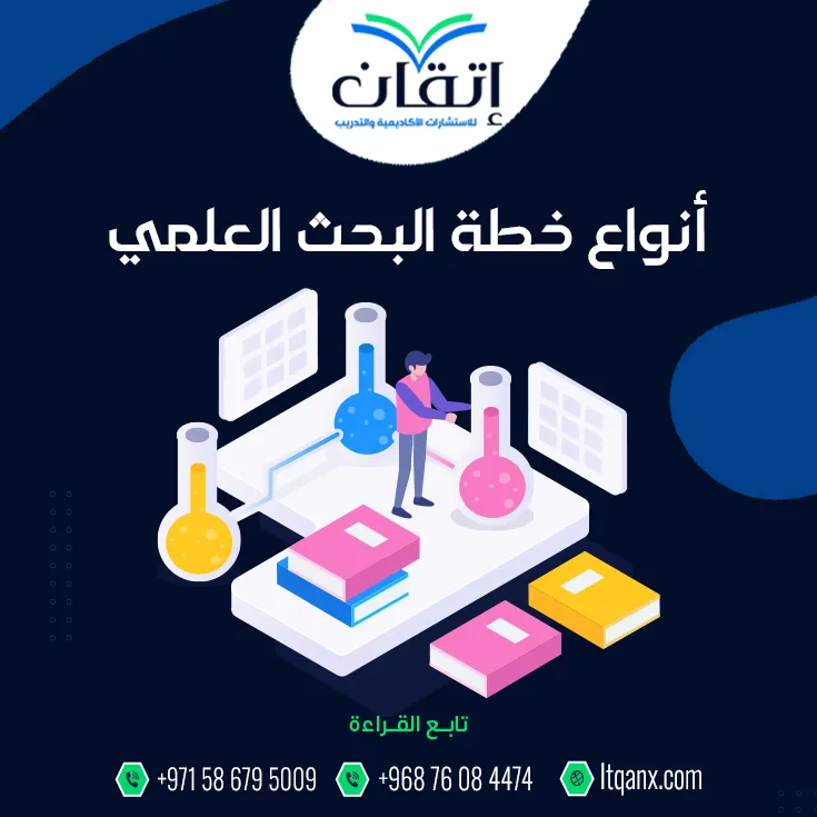 في ختام رحلتك الأكاديمية، تجعل شركة إتقان للاستشارات الأكاديمية والتدريب تجربتك البحثية أكثر سلاسة واحترافية، ففريقنا المتخصص يقدم لك الدعم الكامل في إعداد أنواع خطة البحث العلمي ومراجعة الدراسات وتصحيح الأخطاء لضمان أعلى معايير الجودة العلمية، كما أن إتقان تقدم خدمات البحث العلمي والدورات التدريبية في الدول العربية، مثل: المملكة العربية السعودية، الإمارات، قطر، الكويت، وعمان، مع   نقدم لك  المساعدة في كتابة خطة البحث العلمي، إمكانية التواصل بسهولة عبر الواتساب، لتتمكن من إنجاز بحثك بكفاءة واحترافية عالية.