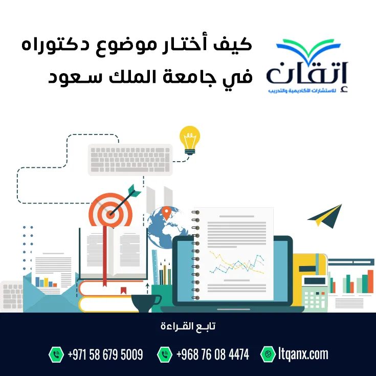 في الختام، بعد الإجابة عن سؤال كيف أختار موضوع دكتوراه في جامعة الملك سعود؛ فإنه يُعد خطوة علمية محورية تحدد مسار الباحث الأكاديمي ومستقبله البحثي، وعمقًا في التحليل، وفي هذا الإطار يمكن الاستفادة من الدعم الذي تقدمه جهات متخصصة مثل إتقان للاستشارات الأكاديمية والتدريب، التي توفر خدمات الإرشاد الأكاديمي والتوجيه في اختيار موضوعات بحثية مناسبة وصياغتها بشكل علمي احترافي، وتقدم الشركة خدماتها عبر فروعها وممثليها في المملكة العربية السعودية والإمارات والكويت وعُمان وغيرها من الدول العربية، ونقدم لك أفضل مراكز لعمل رسائل الماجستير، ويمكن التواصل مع الشركة عبر الواتساب.