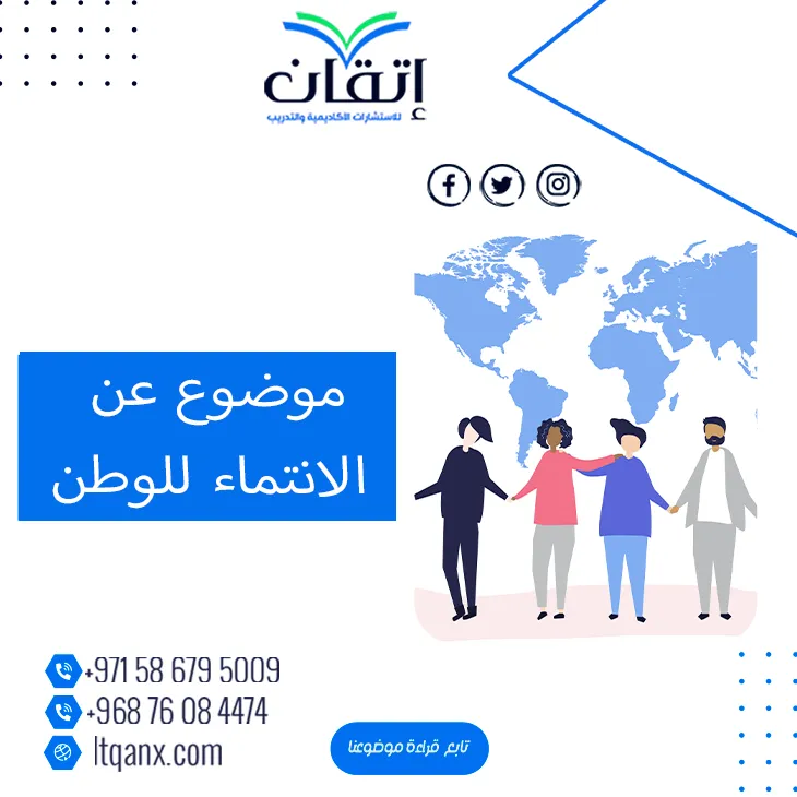 إن دراسة موضوع عن الانتماء للوطن من أهم الأسس التي تعطي شعور عميق يتجاوز الحدود الجغرافية، فهو يعكس الارتباط القوي بالمكان والثقافة والتاريخ، يعزز هذا الانتماء من الهوية الشخصية والاجتماعية؛ مما يسهم في بناء مجتمع متماسك وقوي؛ من خلال تعزيز الفخر بالتراث، وتطوير المسؤولية الاجتماعية، ودعم التنمية الاقتصادية، يصبح الانتماء للوطن ركيزة أساسية لتحقيق الاستقرار والتقدم، إن تعزيز هذا الشعور لدى الأجيال القادمة يعد مسؤولية جماعية، تساهم في بناء مستقبل أفضل للجميع، نحن أفضل شركات البحث العلمي في إتقان للاستشارات الأكاديمية والتدريب، نقدم لك المساعدة في كتابة البحوث الجامعية، كل ما عليك التواصل معنا عبر الواتساب.